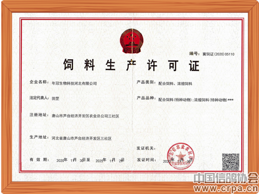 2021年1月11日,河北省农业农村厅正式向年冠生物颁发了“民生保供企业资质证明”,这是信鸽饲料首次被纳入我国民生保供产品。