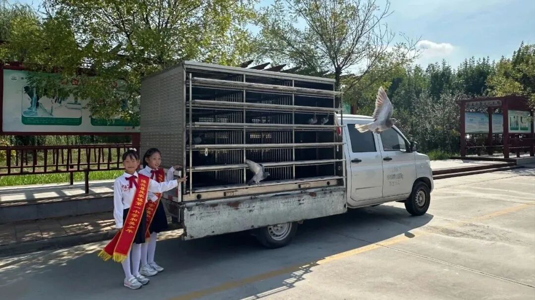 仪式上,现场放飞300多只信鸽,信鸽在庞家一小校园的上空盘旋,象征着和平、希望与拼搏。学生们仰望信鸽,欢呼,雀跃,朝气蓬勃。